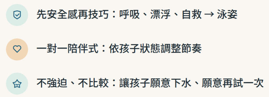 從不敢下水 → 願意把臉放進水 → 能自己漂浮